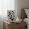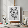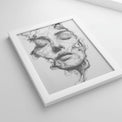 The artwork captures a haunting yet serene visage suspended between form and dissolution. A woman’s face emerges from swirls of smoke, her eyes closed as if in surrender to a quiet dream or an eternal release. The fine, tangled lines echo both fragility and resilience, as though her very being is woven from mist and memory.