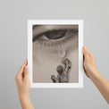 A rare and evocative masterpiece that transcends mere depiction, The Child Who Heals Tears captures the eternal dialogue between sorrow and innocence. The monumental eye, shedding a single tear, reflects the universal weight of human grief — yet it is met by the tender gesture of a child, reaching upward to heal with unshaken purity. This profound juxtaposition elevates the work into a timeless meditation on love, compassion, and resilience.